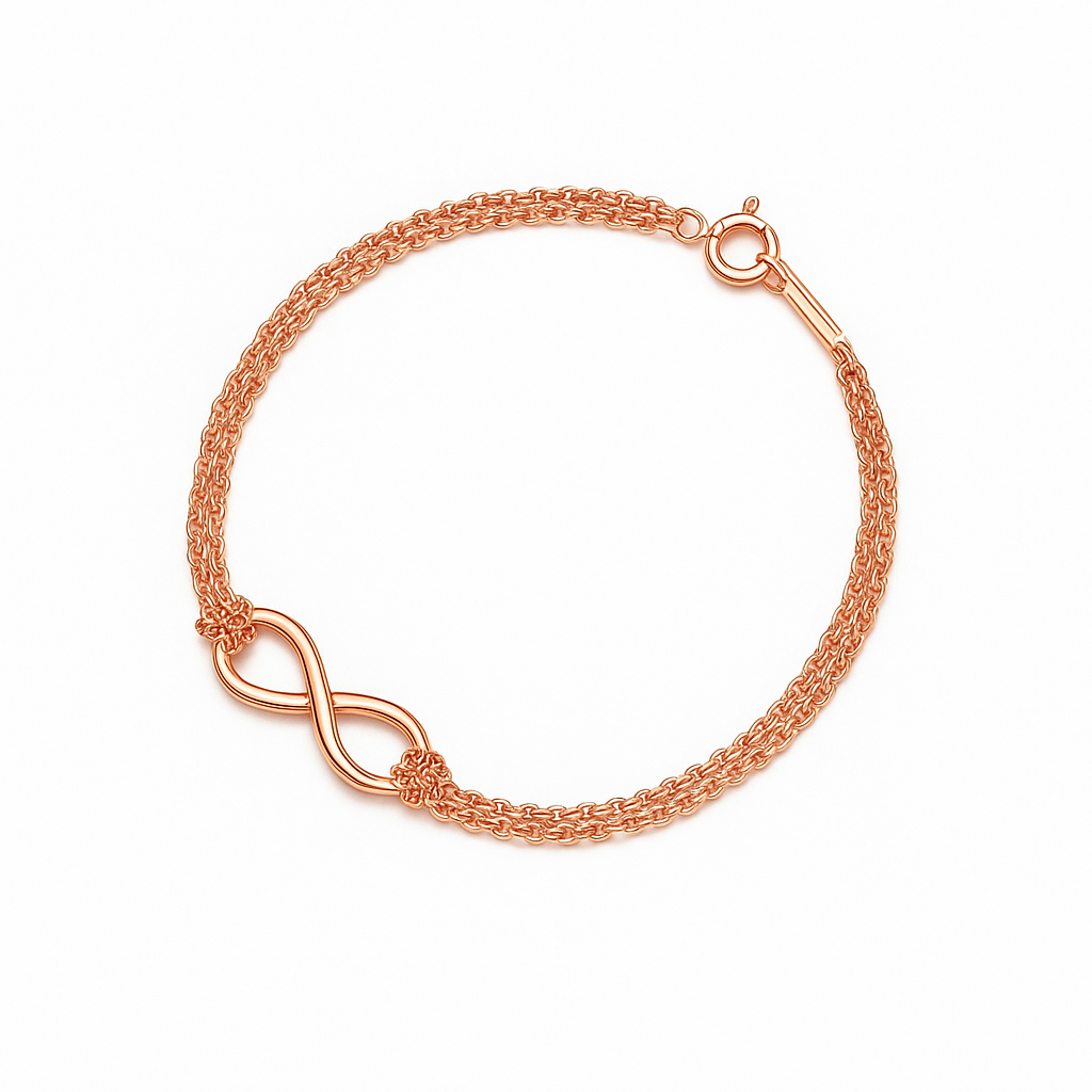 Cloaked in radiant rose gold, this masterpiece entwines two delicate chains, not merely for grace but for steadfast balance, symbolizing strength in unity. At its heart rests the timeless infinity emblem — a whisper of everlasting devotion, whether gifted to a cherished soul or as a vow of self-love.